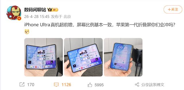快科技4月28日消息股票正规配资官网,今日,博主“数码闲聊站”发文分享了三张图片,并配文称:iPhone Ultra真机超前瞻,屏幕比例基本一致,苹果第一代折叠屏你们会冲吗?