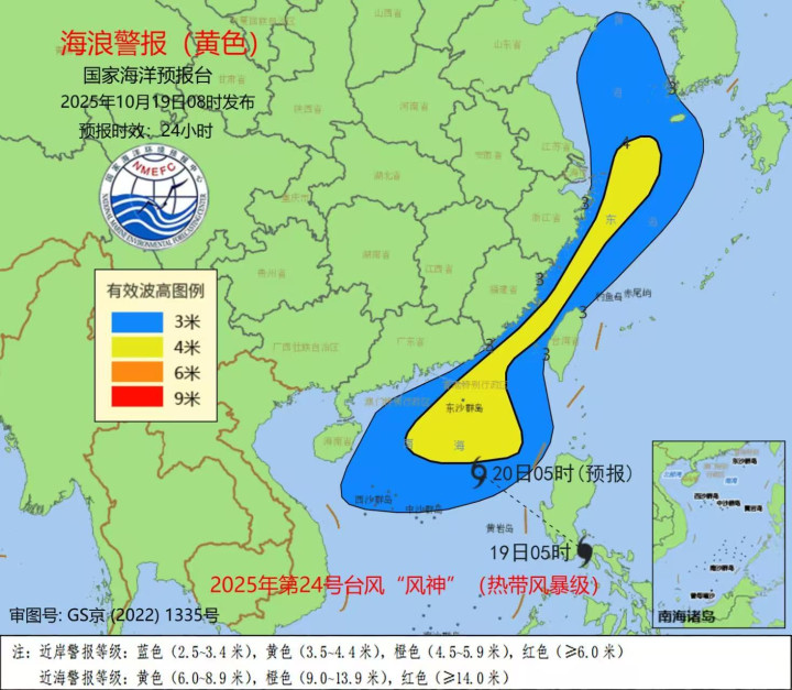 海浪方面,预计10月19日上午到20日上午,东海、台湾海峡、南海北部将出现3到5.5米的大浪到巨浪区,渤海、黄海将出现2.5到3.8米的大浪区;浙江、福建近岸海域将出现3到4米的大浪到巨浪,该近岸海域海浪预警级别为黄色,山东东部、江苏南部、上海、广东东部近岸海域将出现2到3.4米的中浪到大浪,该近岸海域海浪预警级别为蓝色。请在上述海域作业的船只注意安全,沿海各有关单位提前采取防浪避浪措施。