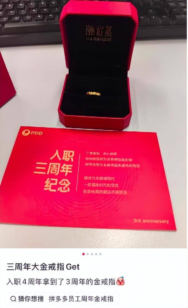 根据员工分享的信息,此次纪念礼的发放标准与司龄直接相关:入职满3年的员工获得约4克重的金戒指,5年司龄的员工则收到11克重的金戒指,而司龄达10年的资深员工可获赠100克重的“金鸡”工艺品。有员工在社交媒体上感慨:“近期金价持续走高,公司这时候发黄金制品实在贴心。”