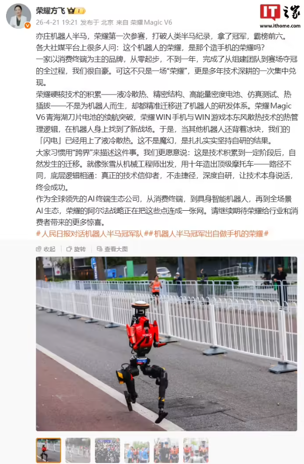 赛事结束后,荣耀终端股份有限公司产品线总裁方飞发文谈及这次霸榜成绩,她表示,这份成果并非偶然的跨界突破,而是荣耀多年技术深耕的一次集中兑现,那些在消费电子领域沉淀多年的技术能力,不是为机器人研发而生,却在这次赛事中完成了精准的迁移与落地,成为荣耀拿下碾压式优势的核心秘诀。