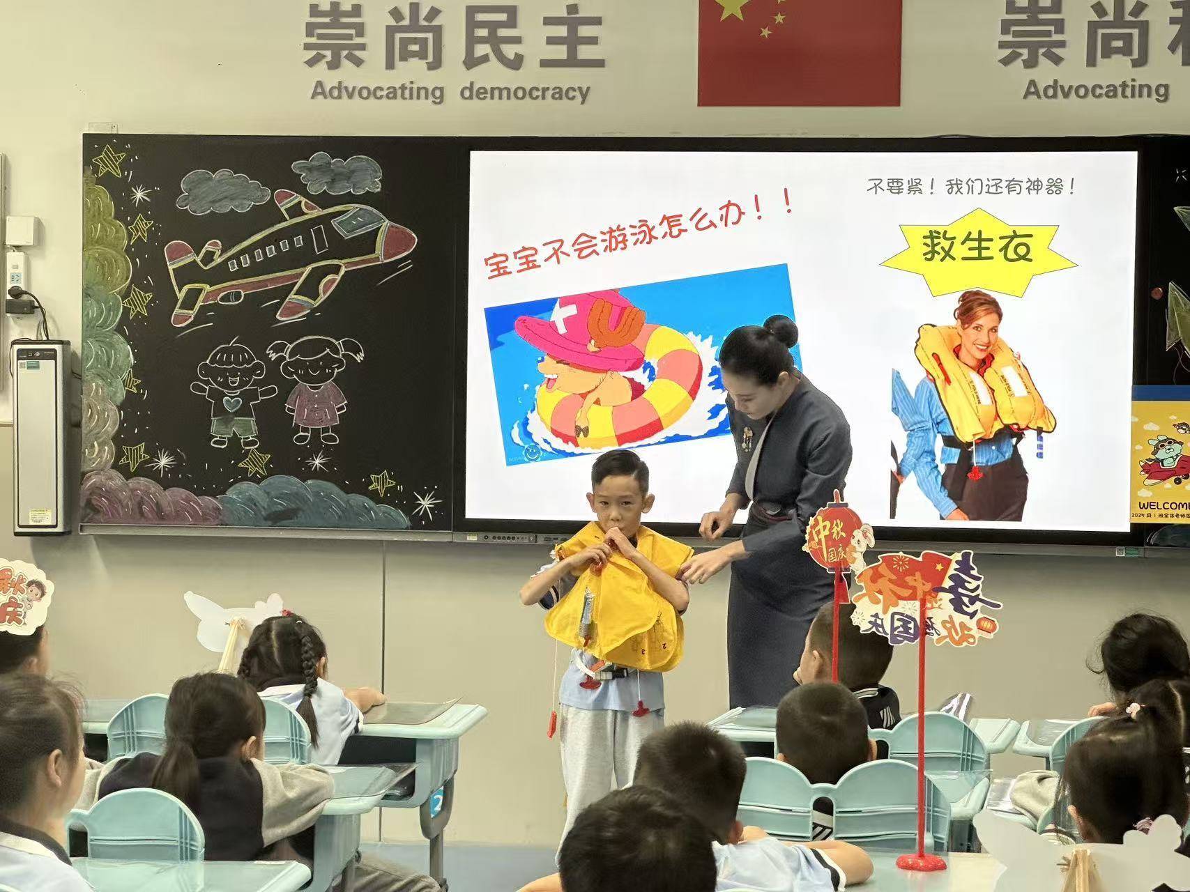 "变身!我是超级空乘!"互动环节中,同学们分组扮演乘客与空乘人员。在乘务员指导下,大家掌握了"肩带下拉-卡扣对接-松紧调节"的安全带速系三步法,亲身体验了救生衣充气操作。当被问及"氧气面罩掉落时应先帮助自己还是他人"时,教室里立刻举起的手臂如密林般密集,孩子们响亮的回答展现出对安全知识的快速吸收。